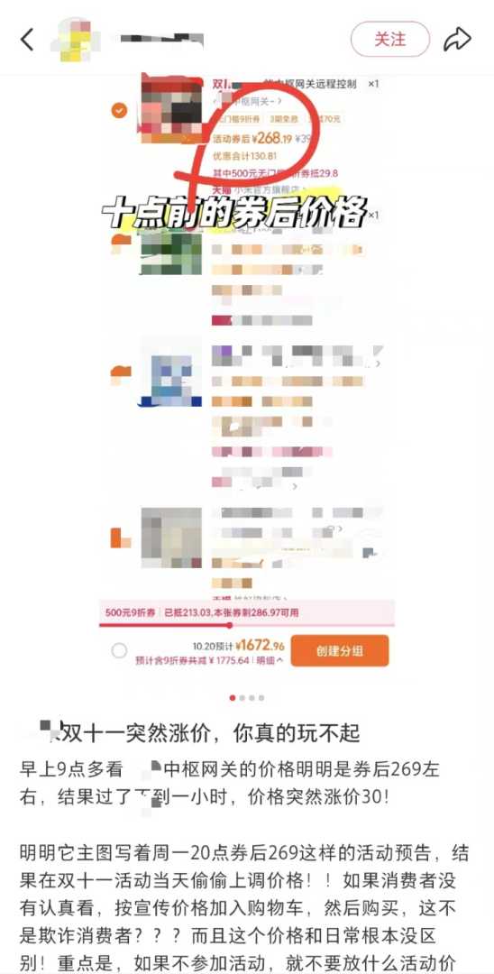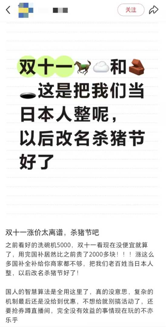 (消费者反馈双十一价格上升的内容图片来源:社交媒体平台)