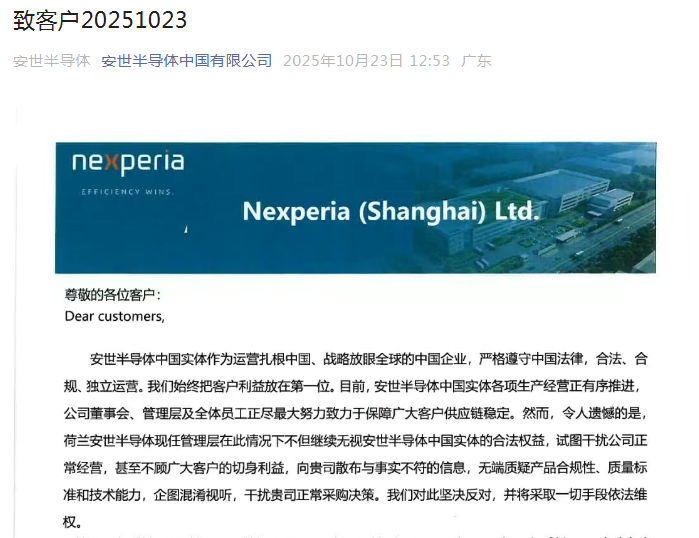 这封落款为安世半导体(上海)有限公司的《致客户信》显示,目前,安世半导体中国实体各项生产经营正有序推进,公司董事会、管理层及全体员工正尽最大努力致力于保障广大客户供应链稳定。然而,令人遗憾的是,荷兰安世半导体现任管理层在此情况下不但继续无视安世半导体中国实体的合法权益,试图干扰公司正常经营,甚至不顾广大客户的切身利益,向客户散布与事实不符的信息,无端质疑产品合规性、质量标准和技术能力,企图混淆视听,干扰客户正常采购决策。公司对此坚决反对,并将采取一切手段依法维权。