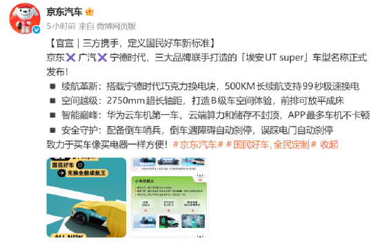 另外,10月23日,京东联合宁德时代、广汽集团推出的“国民好车”车型名称官宣,新车命名为“埃安UT super”(SEO关键词3:埃安UT super)。