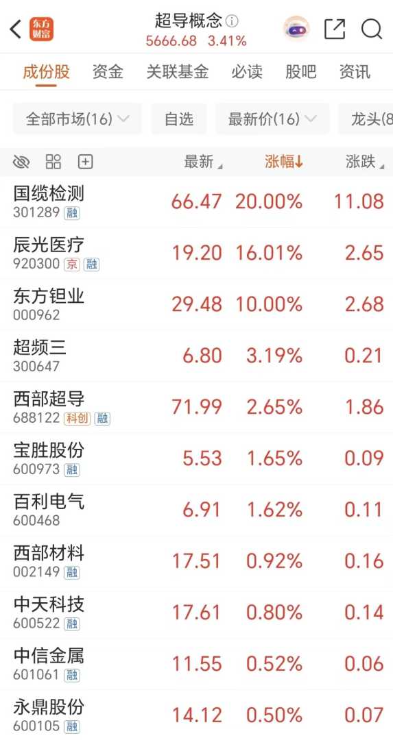 周四(10月23日)超导概念板块大涨超3%,国缆检测20CM涨停,辰光医疗涨超16%,东方钽业涨停,超频三、西部超导等跟涨,超导概念成为市场热点。