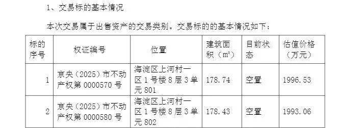 根据资产评估,于估值基准日2025年7月31日,上述两套房产房地合一的市场价值(含增值税)合计为3989.59万元,增值额为3865.18万元,增值率为3106.89%。以此计算,2002年公司买入房产时单价约为7700元/平方米,而如今挂牌的单价约为11.17万元/平方米,房产增值超13倍,凸显房地产价值提升。