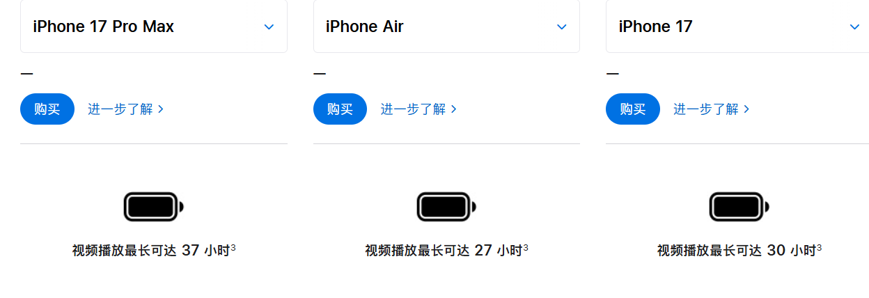 据苹果官方数据也显示,iPhone Air在视频播放续航上表现平平,仅为27小时,远低于iPhone 17 Pro Max的37小时,也落后于标准版iPhone 17的30小时。