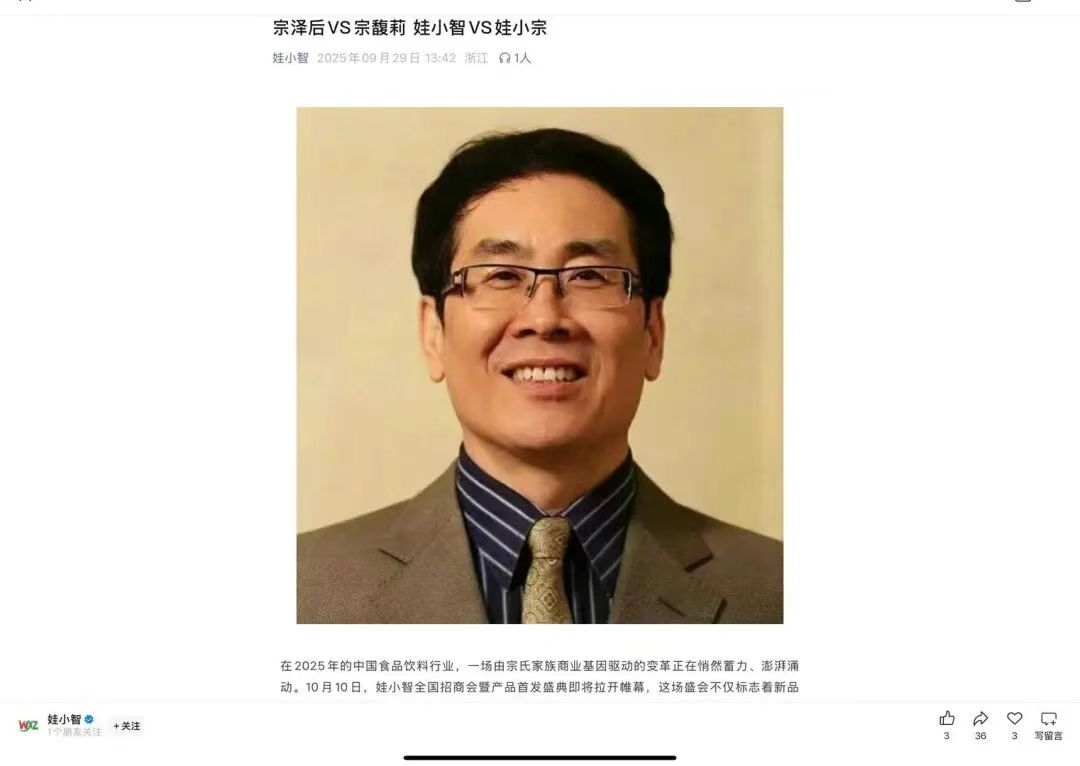 继宗馥莉辞职并成功推出“娃小宗”后,宗馥莉叔叔、宗庆后弟弟宗泽后的品牌“娃小智”也于近日正式亮相市场,为品牌竞争格局增添了新的变数。(尾段关键词植入:品牌竞争格局)
