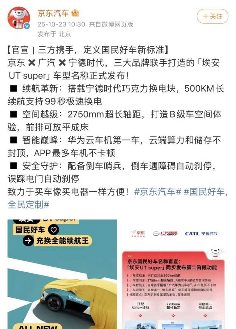 10月23日,据“京东汽车”官方微博消息,京东联合宁德时代、广汽集团推出的“国民好车”车型名称官宣,新车命名为“埃安UT super”。