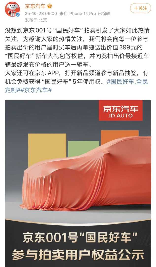 当天,除了公布新车的名字,京东汽车更回应了京东001号车拍出“天价”的事情。京东汽车表示,没想到京东001号“国民好车”拍卖引发了大家如此热情关注,为感谢关注,将会向每一位参与拍卖出价的用户届时买车后再单独送出价值399元的“国民好车”新车大礼包等权益,并向竞拍出价最接近车辆最终发布价格的用户送一辆车。京东汽车还称,消费者可在京东App参与新品抽签,有机会免费获得“国民好车”5年使用权。