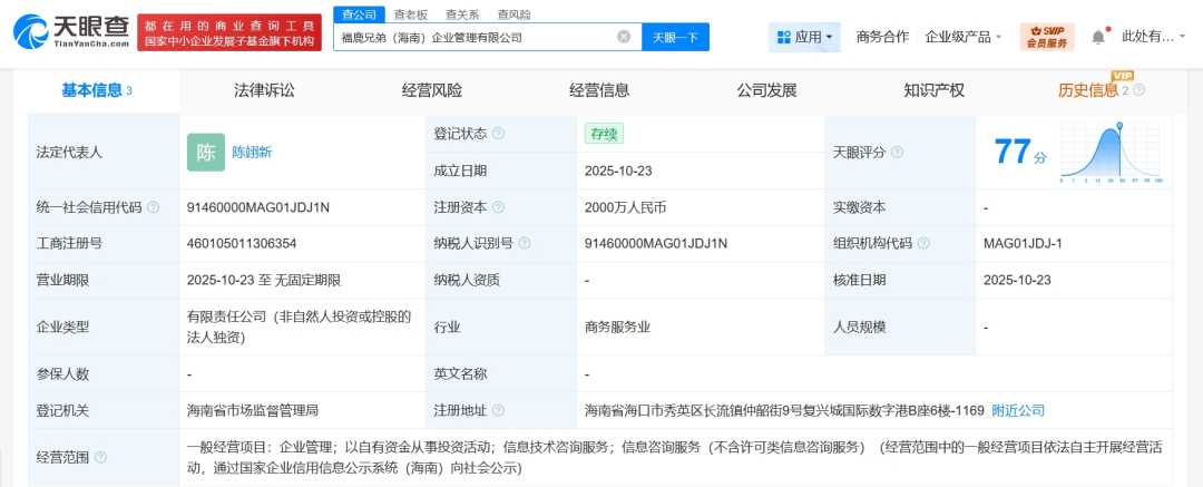 福鹿兄弟(海南)企业管理公司成立 蜜雪冰城全资持股
