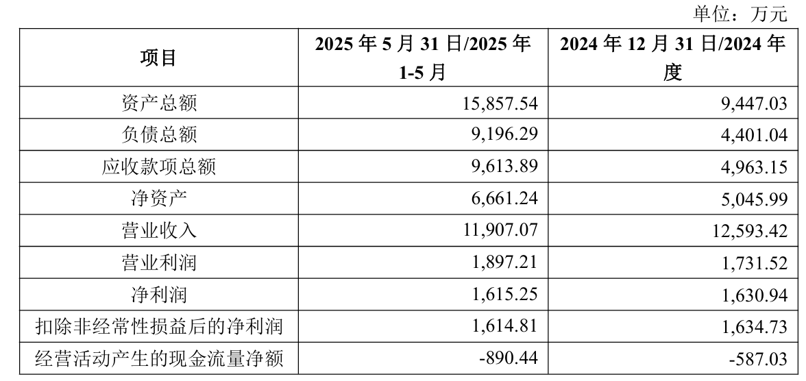2024年及2025年前五月,国联电子营业收入分别为1.26亿元、1.19亿元,净利润分别为1630.94万元、1615.25万元,经营性现金流持续为负值。截至今年5月末,公司净资产为6661.24万元、应收款项为9613.89万元,财务状况备受关注。