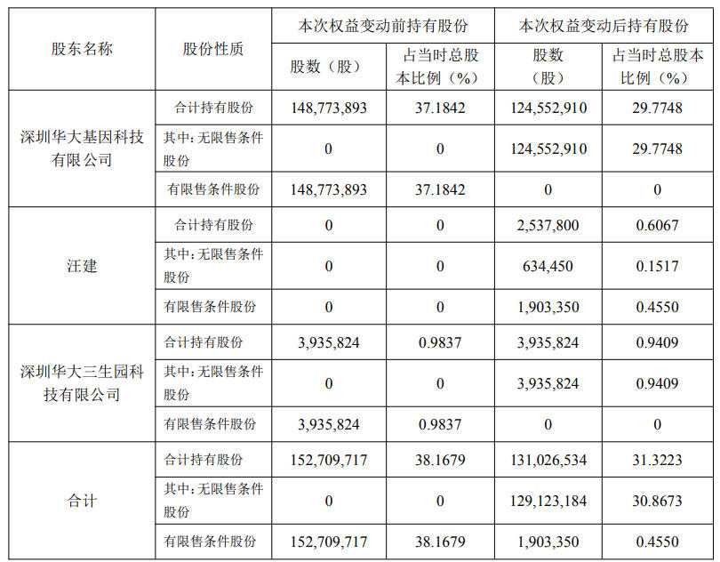 公告显示,此次减持目的则为华大控股自身资金需求(主要用于支持新质生产力方向的前沿科技孵化)。而根据华大基因2025年3月18日公告,减持主要是华大控股上层股权结构调整所产生的资金需求,即收购华大控股自然人股东王俊个人股份的资金需求。华大基因指出,实际该部分减持金额主要用于了汪建间接增持华大基因的股份。