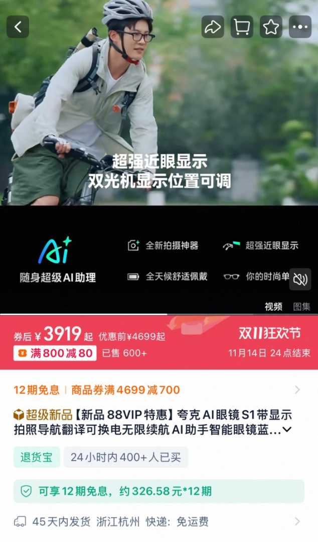 界面新闻注意到,截至发稿,该眼镜销售量已达600+,发货时间显示为45天内。这也是夸克智能设备天猫旗舰店内唯一一款在售商品,而京东、抖音电商等平台暂无夸克AI眼镜销售。