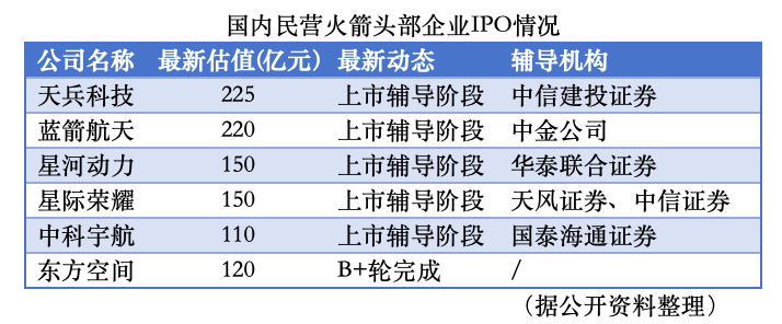 至此,国内已有过火箭入轨纪录的商业火箭公司中,除东方空间外,均已启动IPO冲刺,5家企业总估值超855亿元。一场关于“民营火箭第一股”的争夺战悄然打响。