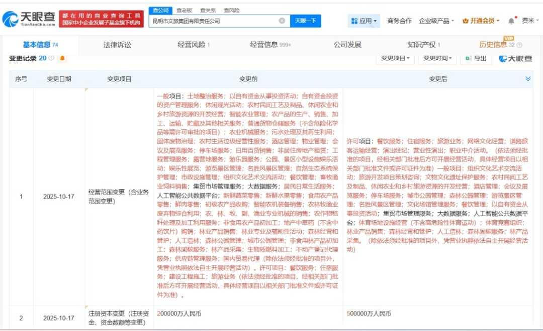 近日,昆明市文旅集团有限责任公司注册资本由20亿增至50亿,增幅150%。该公司由昆明市人民政府国有资产监督管理委员会全资持股,业务涵盖餐饮、住宿及旅游业务,实力显著提升。