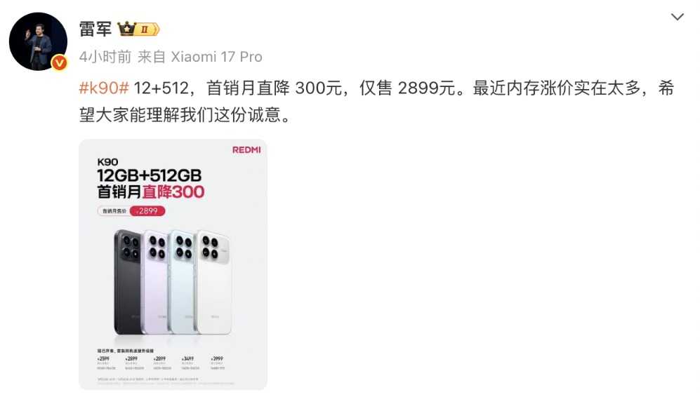 卢伟冰提到,不少用户对此表达了些许失望。经过内部讨论,小米决定K90标准版12GB+512GB版本首销月内直降300元,价格调整为2899元。12GB+512GB是小米用户关注度较高的版本,此次调整也体现了小米对用户反馈的重视。