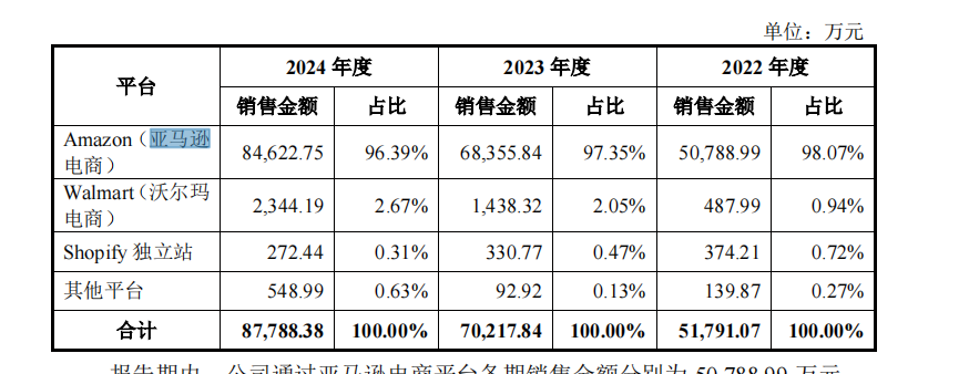 线上直销模式是公司收入基本盘,三年分别收入5.2亿元、7亿元及8.9亿元,占总收入的48.5%、60.6%和59%。而公司的线上直销收入又高度依赖亚马逊平台,主要是占比超9成的亚马逊电商,以及沃尔玛电商、Shopify等境外电商平台。