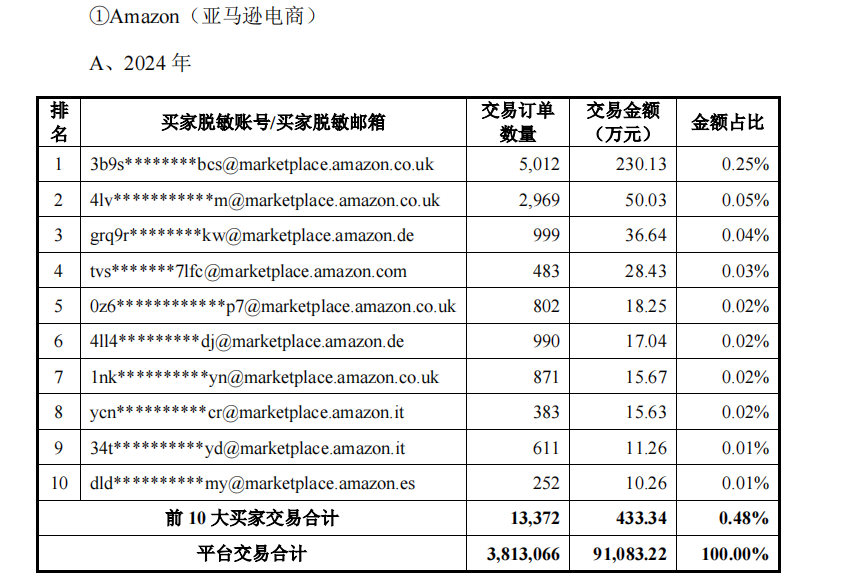 根据2024年亚马逊电商前10大买家交易订单数量,第一大客户年消费230万元,并且在报告期内均为第一大客户,而2022年消费33万元,2024年增长超7倍到230万元;至于第二大买家在2024年首次出现在前十大买家列表。但邦泽创科解释称,前两大买家均为企业客户,有可能是线上批发商。
