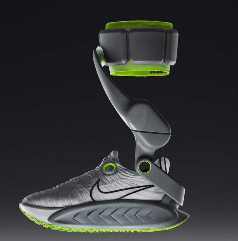 从外观来看,Amplify像是某种外骨骼设备的一部分,通过环绕脚踝的传动设备为人体运动提供助力,使得向前移动的速度和轻松度显著提升。耐克将穿着体验类比电助力自行车,这类车辆仍需要人踩踏板,同时使用电动机增强踩踏的动力,展现了科技与运动的完美结合。