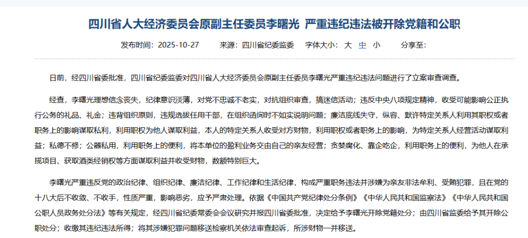 四川省人大经济委员会原副主任委员李曙光严重违纪违法被开除党籍和公职