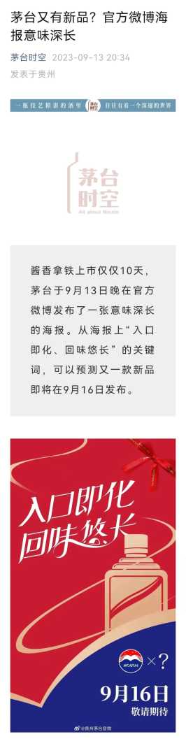 9月13日晚间,贵州茅台官方微博发布了一张富有深意的海报,上面写有“入口即化、回味悠长”的字样,并神秘地提示“贵州茅台×?”,同时告知消费者9月16日将揭晓答案,敬请期待。