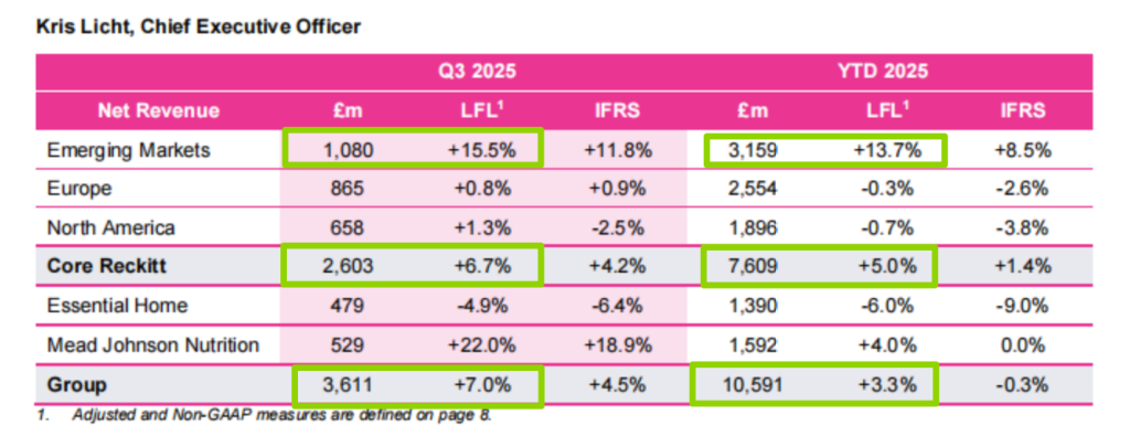 利洁时集团CEO李开睿(Kris Licht)在财报中指出,在充满挑战的消费环境中,集团在发达市场恢复了增长,并在新兴市场继续实现了超乎寻常的增长。集团对目前的业绩感到满意,并有信心实现2025年全年目标。财报显示,第三季度利洁时核心业务所有领域均实现增长,核心业务净收入超出预期,第三季度增长6.7%至26.03亿英镑,前三季度增长5%至76.09亿英镑。