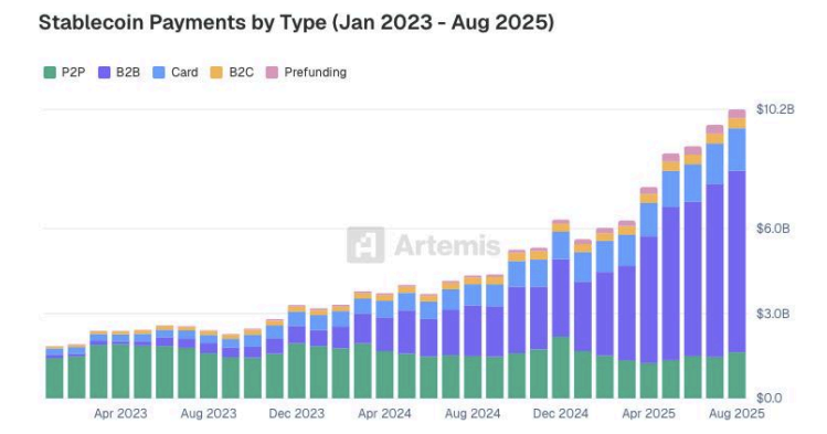 而且随着监管框架落地,企业对企业的转账已经构成稳定币支付大头,消费者点对点交易一直保持在每月16亿美元。Artemis数据科学家Andrew Van Aken表示:“企业已经受够了非常繁琐的国际转账流程:先把钱发到这家银行的账户,再由这家银行发到另一家银行,然后再发到另一家银行。”