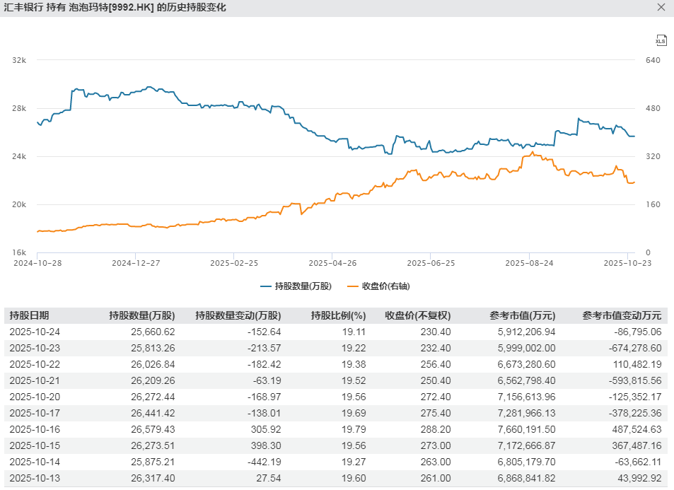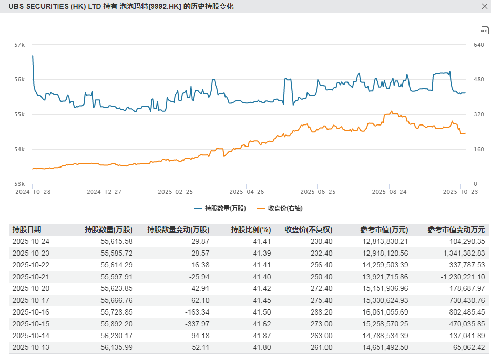 LABUBU在二级市场价格“雪崩”引发市场的担忧。自今年8月的历史最高点以来,泡泡玛特股价已跌超30%,10月27日收盘价报233.40港元/股,市值蒸发超1400亿港元。不过,LABUBU二级市场价格崩盘的导火索,是泡泡玛特主动调整供需策略。业内人士指出,过去,LABUBU的稀缺性被黄牛利用,二级市场价格严重偏离发行价,损害普通消费者体验。公司通过提升产能、优化渠道供给,旨在打击炒货行为、维护价盘稳定。短期看,这一举措导致二手市场投机资金撤离,但长期看,有助于扩大用户基础、提升品牌口碑。尽管泡泡玛特股价接连调整,但公司的业绩持续向好。近日,泡泡玛特披露的2025年第三季度财报显示,公司第三季度整体收益(未经审核)同比大幅增长245%—250%,延续了上半年的高增长态势。分区域看,中国市场第三季度收入同比大幅增长185%—190%,线上渠道增速高达300%—305%,线下渠道同比增长130%—135%;海外市场的表现更为亮眼,第三季度整体收入同比大幅飙升365%—370%,其中美洲市场以1265%—1270%的同比增速一骑绝尘,欧洲及亚太地区分别大幅增长735%—740%、170%—175%。在公司业绩公布后,券商机构普遍上调了公司的盈利预测。Wind数据显示,截至8月末,机构预测泡泡玛特2025年营业收入的均值约为300亿元,截至最新日期的预测均值上升至接近350亿元;截至8月末,机构预测泡泡玛特2025年净利润的均值约为96亿元,截至最新日期的预测均值上升至115亿元。高盛发表的研究报告指出,泡泡玛特第三季收入按年增长245%—250%,较上半年增长进一步加速,并超越该行早前料下半年增长167%的预期。该行认为,第三季业绩超市场预期,主要因IP势头强劲,及供应能力扩张带动变现能力提升。展望未来,高盛认为,泡泡玛特第四季增长能见度仍然很高,因适逢旺季并将有主题产品发布,加上供应能力提升,以及门店网络持续扩张仍可提供支持。该行将2025年盈利预测上调7%,维持“中性”评级及目标价350港元。摩根大通近期将泡泡玛特评级从“中性”上调至“增持”,认为股价经过一定时间的调整后估值已具吸引力,且第三季度财报数据、节假日销售情况及LABUBU动画等将成为未来催化剂。公司股价与业绩形成鲜明反差的背后,多位分析人士认为,市场分歧的焦点在于,目前LABUBU贡献了公司主要业绩,若LABUBU的热度下降,而新IP孵化不及预期,增长动力可能面临不足;同时,今年以来,泡泡玛特股价翻倍增长,在近期LABUBU二手市场价格降温的情况下,部分投资者选择获利了结,形成集中抛售压力。在近期泡泡玛特股价接连下跌之际,内地资金展现出强烈的“抄底”意愿。Wind数据显示,截至10月11日,南向资金通过港股通持有泡泡玛特的股份为1.92亿股,占总股本的14.30%;截至10月24日的持股数增加至2.12亿股,占总股本比例增长至15.81%。不过,由于公司股价持续下跌,南向持股市值由截至10月11日的498.80亿港元,下降至截至10月24日的489.42亿港元。与内地资金形成鲜明对比的是,外资却在接连减持泡泡玛特。Wind数据显示,中介机构瑞银证券持有泡泡玛特的市值最大,但该机构在10月15日和10月16日曾大手笔减持泡泡玛特,减持股份数分别为337.97万股和163.34万股。汇丰银行也在近日接连减持泡泡玛特。数据显示,汇丰银行在10月14日减持了442.19万股泡泡玛特股份,10月15日、10月16日分别增持398.30万股、305.92万股。随后,该机构接连减持泡泡玛特,自10月17日以来累计减持了918.80万股。此外,花旗银行、摩根士丹利国际等中介机构的持仓近期减持也比较明显。