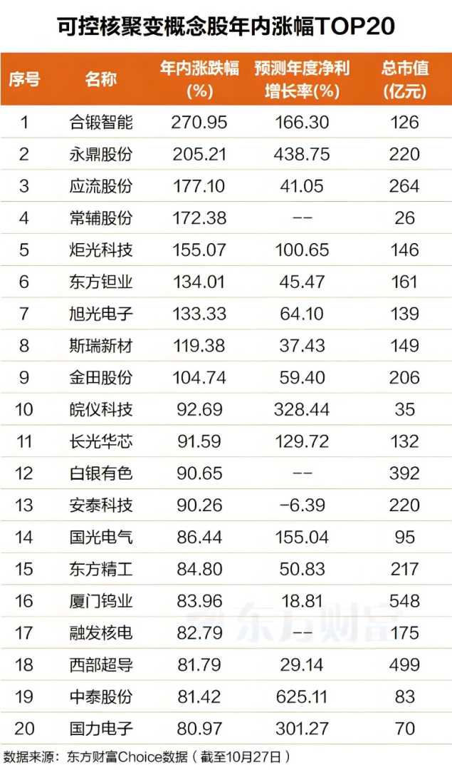 皖仪科技、长光华芯、白银有色、安泰科技、国光电气、东方精工、厦门钨业、融发核电、西部超导等个股年内涨幅也在80%至93%之间,显示资金对核聚变产业链的深度布局。