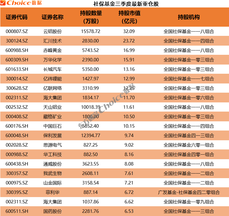 社保基金出现在157家公司的前十大流通股东名单中,其持仓动向备受市场关注(社保动向,市场关注)。其中,全国社保基金一一八组合持有云铝股份1.56亿股,持股市值32.09亿元,还持有赤峰黄金16.99亿元、天山铝业11.61亿元;全国社保基金一一四组合持有汇川技术2830万股,持股市值23.72亿元;全国社保基金一零三组合持有万华化学15.91亿元。此外,长城汽车、亿纬锂能、亿联网络、藏格矿业等被社保基金持有市值均超10亿元。