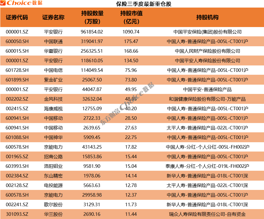 保险公司持股方面,在已公布2025年三季报的上市公司中,中国平安(集团)持有平安银行96.19亿股,持股市值1090.74亿元;中国人寿旗下保险产品持有中国联通31.9亿股,持股市值175.47亿元;中国人保财险持有华夏银行168.66亿元。紫金矿业、金风科技、海康威视等被保险持有市值均超40亿元,显示出保险资金对市场的深度参与(保险资金,市场参与)。