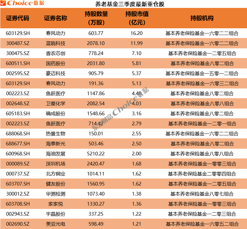 在已公布2025年三季报的上市公司中,养老基金持股市值最高的个股是春风动力,养老金一六零二二组合、一六零三二组合分别持有603.77万股、191.36万股,持股市值16.20亿元、5.13亿元;其次是蓝晓科技,一六零二二组合持有2078.1万股,持股市值11.99亿元。此外,一二零五组合持有香农芯创7.1亿元,八零二组合持有国药股份5.81亿元,养老基金的持仓动向同样值得关注(养老基金,持仓动向)。