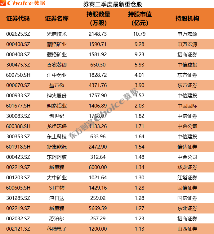 在已公布2025年三季报的上市公司中,申万宏源、招商证券分别持有藏格矿业1590.71万股、1581.92万股,持股市值9.28亿元、9.23亿元;申万宏源还持有光启技术10.79亿元。中信建投、东方证券分别持有香农芯创、江中药业5.93亿元、4.01亿元,券商的持仓调整也反映了其对市场的判断(券商持仓,市场判断)。