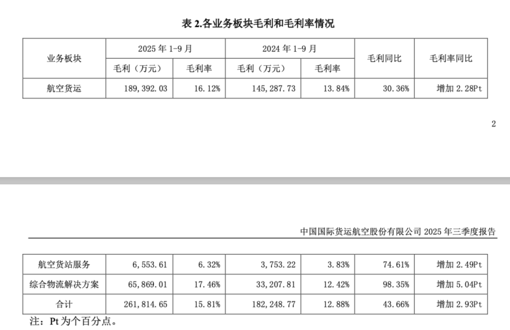 对于净利增长,财报指出,主要由于三季度公司货机机队规模相对2024年同期有明显增长,同时,公司航空货运服务、航空货站服务、综合物流解决方案三大业务板块均取得了较好的经营结果,航空物流竞争力不断提升。