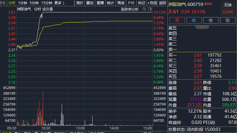 截至下午收盘,洲际油气、惠博普涨停,中国海油涨近5%,中国石油涨超4%,通源石油涨近4%,贝肯能源、中曼石油、海油工程涨超3%,石化油服、准油股份等涨超2%,中国石化涨近2%。