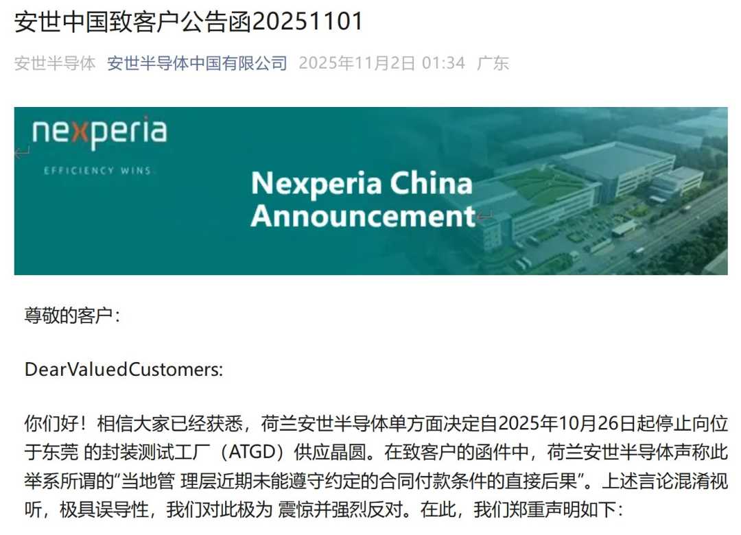 11月2日凌晨,安世半导体中国有限公司(以下简称安世中国)微信公众号发文称,荷兰安世半导体单方面决定自2025年10月26日起停止向位于东莞的封装测试工厂(ATGD)供应晶圆。这一决定引发半导体行业对供应链稳定性的担忧。