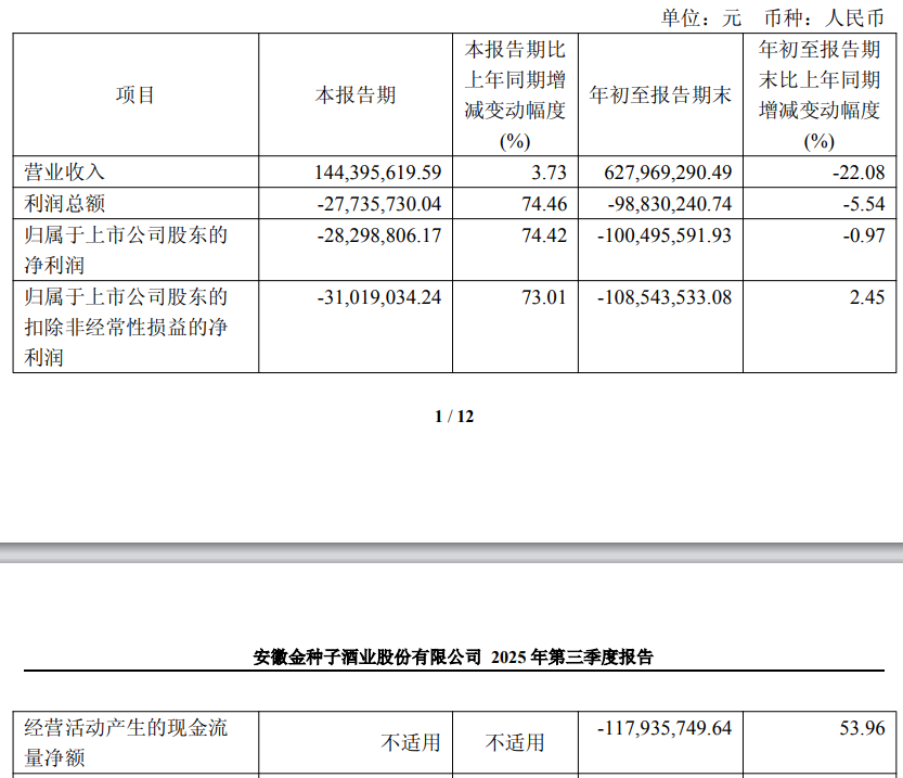 10月29日,金种子酒(600199)公布2025年三季报,公司前三季营业收入为6.28亿元,同比下降22.08%;归母净利润自去年同期亏损9953万元变为亏损1亿元,亏损额进一步扩大;扣非归母净利润自去年同期亏损1.11亿元变为亏损1.09亿元,亏损额有所减少;经营现金流净额为-1.18亿元,同比增长53.96%。白酒市场整体调整背景下,金种子酒的业绩波动引发关注。