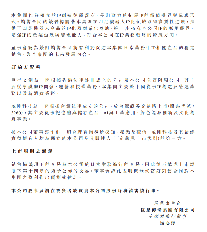 巨星传奇在公告中表示,销售合同的签署标志着集团在四足机器人IP化领域取得实质性进展。该公司长期致力于拓展IP的价值边界与呈现形式,此次合作推动了四足机器人产品的IP化及商业化落地,进一步拓宽公司IP的应用边界,展现了其在IP运营领域的深厚实力。