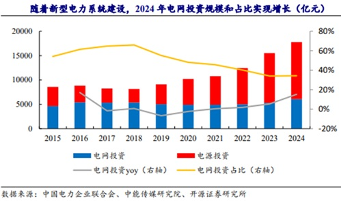 开源证券表示,过去的2024年,我国电力行业投资总额为17770亿元,同比增长14.63%。其中电源投资总额为11687亿元,电网投资总额为6083亿元,同比增长15.27%,电网投资占比达34.23%,同比增长0.19pcts,电网投资呈现企稳回升态势,电网设备板块迎来发展机遇。