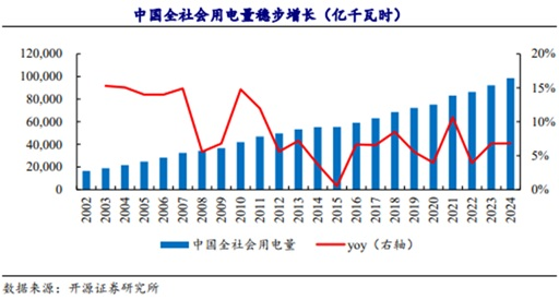 而投资高增长的背后,是我国全社会用电量的快速增长。数据显示,2014年全国社会用电量为55213亿千瓦时,2024年达98521万亿千瓦时,十年间年均复合增长率达5.96%。“十四五”期间,随着高端制造、新能源、新型城镇化等重点领域的快速推进,用电需求进一步释放。开源证券认为,社会用电量的持续攀升,为配网不停电作业市场提供了坚实的需求基础,电网设备板块前景广阔。