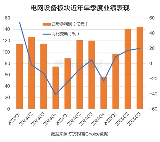 东吴证券认为,2025年电网投资有望持续增长,具备全球竞争力的龙头企业将受益于国内建设与海外市场双轮驱动,尤其看好在特高压、智能电网等领域具备技术优势和订单保障的公司。刚刚披露的三季报来看,电网设备板块前三季度实现归母净利润382.13亿元,同比增长16.03%。其中第三季度实现归母净利润144.14亿元,同比增长20.1%,电网设备板块业绩向好。