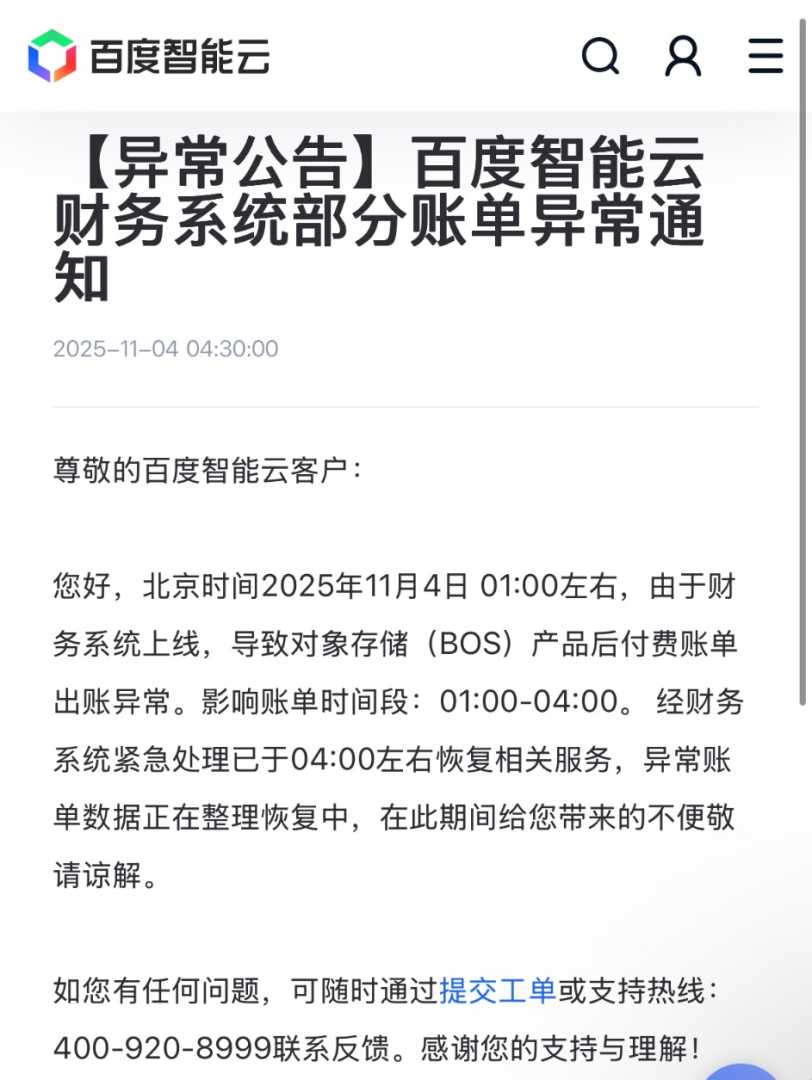 11月4日,百度智能云发布异常公告,2025年11月4日01:00左右因财务系统上线,对象存储(BOS)产品后付费账单出账异常,影响时段01:00 - 04:00,04:00左右恢复服务,异常账单数据正整理恢复。