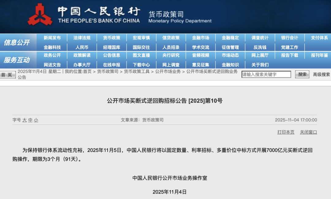 11月4日,央行发布重要公告,为维持银行体系流动性充裕,2025年11月5日,中国人民银行将采取固定数量、利率招标、多重价位中标方式开展7000亿元买断式逆回购操作,期限设定为3个月(91天),这一举措旨在稳定金融市场,促进经济健康发展。同时,这也是货币政策灵活调整的重要体现,对市场流动性产生积极影响。