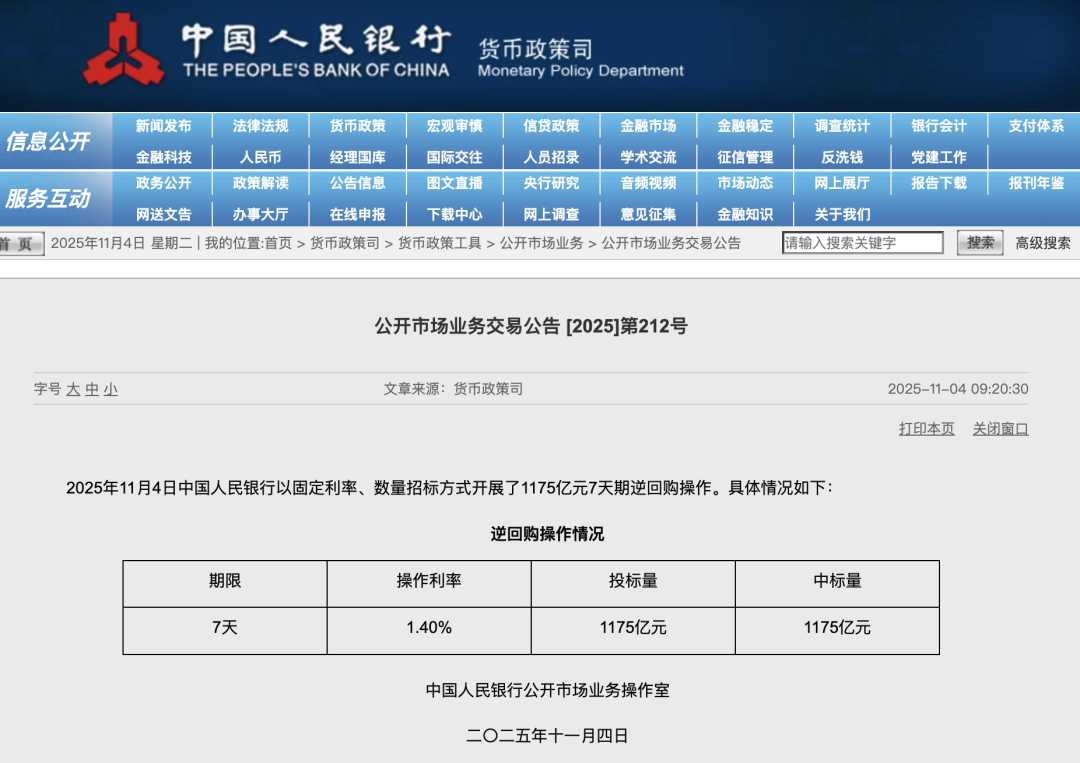 11月4日,央行公告2025年11月5日开展7000亿元买断式逆回购操作,期限3个月。同日早间,央行还开展1175亿元7天期逆回购操作,当日实现净回笼3578亿元。央行副行长表示将灵活把握政策支持力度和节奏,确保货币政策工具有效实施。