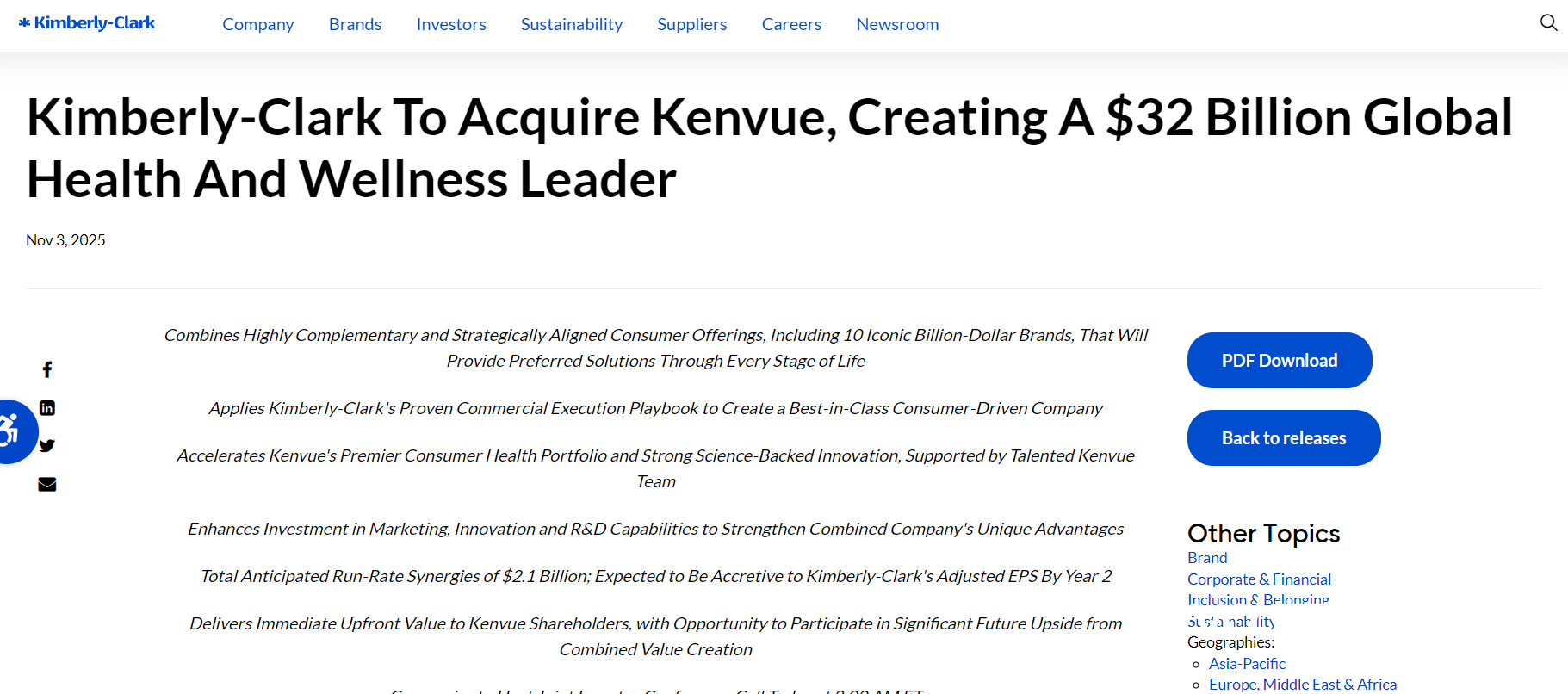 11月3日,拥有舒洁、高洁丝等品牌的快消巨头金佰利(Kimberly-Clark)宣布将以487亿美元的价格收购另一快消巨头科赴公司(Kenvue),后者原为强生集团的消费品业务,拥有大宝、露得清、泰诺等知名品牌。此次收购(关键词1)若交易完成,届时金佰利科赴的合并公司营收将超过联合利华,成为次于宝洁的第二大快消品企业(关键词2)。