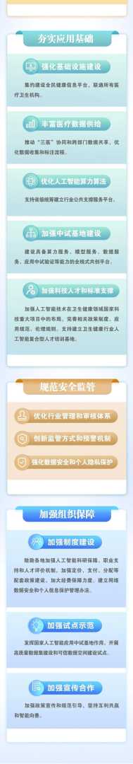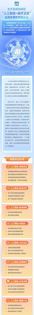 国家多部门联合发布《关于促进和规范“人工智能+医疗卫生”应用发展的实施意见》,涵盖总体要求、深化重点应用、夯实应用基础、规范安全监管及加强组织保障五大方面,推动医疗AI发展。