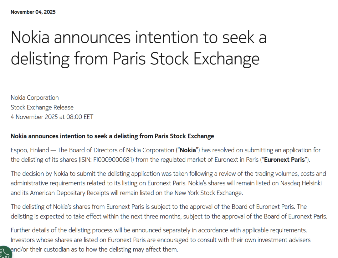当地时间11月4日,通信业巨头诺基亚通过其官网发布声明,公司董事会已决定提交申请,将其股票(ISIN:FI0009000681)从巴黎泛欧交易所退市,这一决定引发市场关注。