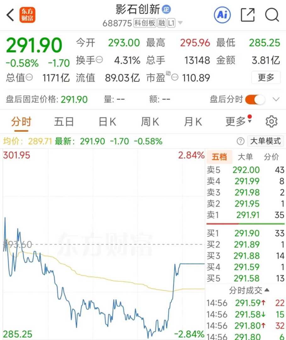 11月4日,影石创新股价收盘价为291.9元/股,微跌0.58%,最新市值约为1171亿。每日经济新闻综合第一财经、21世纪经济报道、界面新闻及公开资料(文章来源:每日经济新闻)