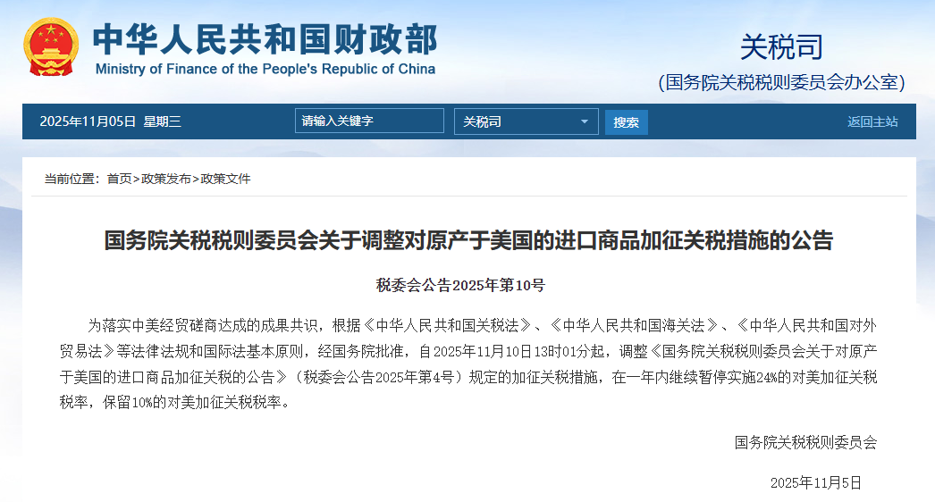 财联社11月5日讯,为落实中美经贸磋商达成的成果共识,根据《中华人民共和国关税法》、《中华人民共和国海关法》、《中华人民共和国对外贸易法》等法律法规和国际法基本原则,经国务院批准,自2025年11月10日13时01分起,调整《国务院关税税则委员会关于对原产于美国的进口商品加征关税的公告》(税委会公告2025年第4号)规定的加征关税措施,在一年内继续暂停实施24%的对美关税税率调整,保留10%的对美加征关税税率。这一举措旨在进一步推动中美经贸关系的健康发展,为两国企业创造更加公平、透明的贸易环境。