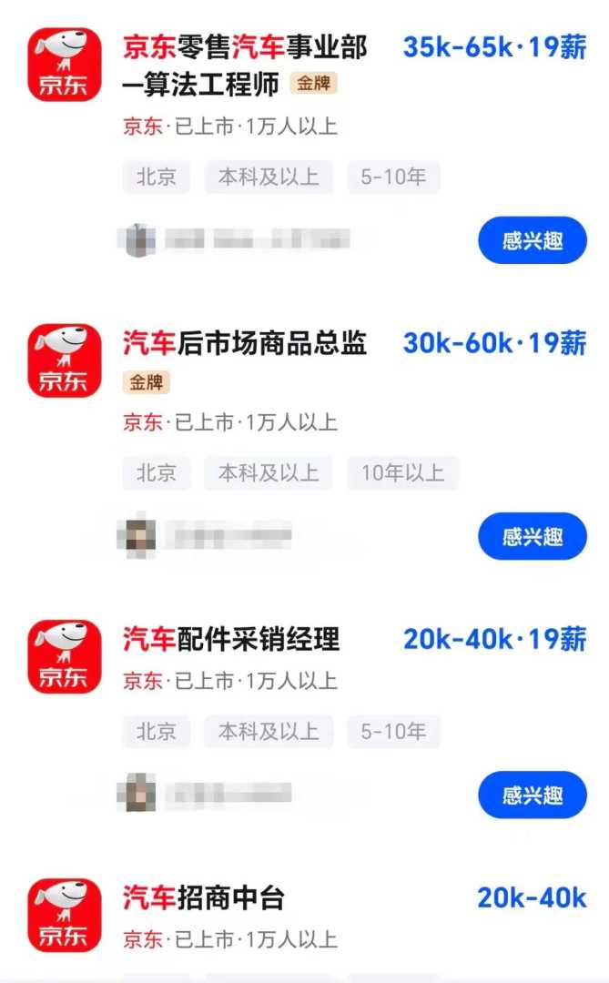 10月16日,京东在招聘平台发布的多个汽车相关岗位招聘曝光,其中,汽车零售事业部算法岗、汽车行业采销负责人年薪均过百万。
