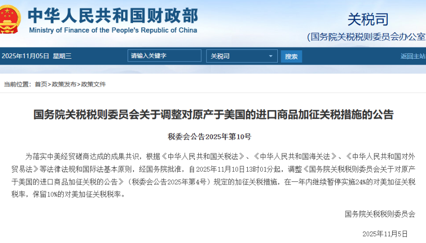 国务院关税税则委员会公告,自2025年11月10日起调整对美进口商品加征关税措施,暂停24%税率,保留10%税率,推进中美贸易合作。