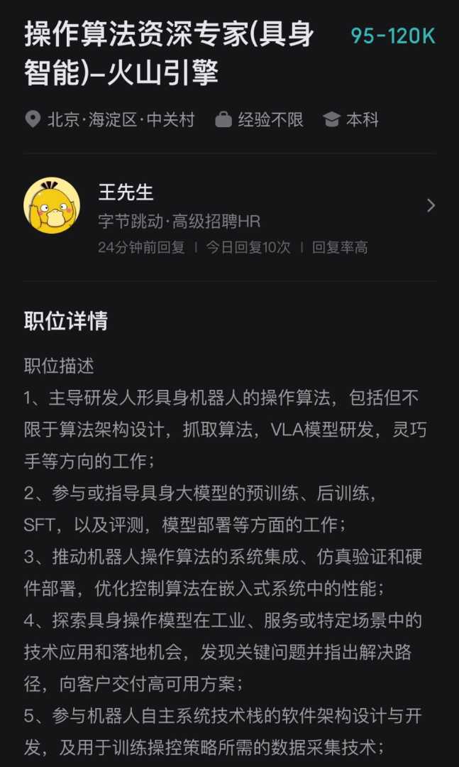 除了操作算法资深专家,字节跳动同时也在招聘具身智能数据开发工程师、具身智能推理性能优化工程师、运动控制算法资深专家等**具身领域**相关岗位,形成完整技术梯队。