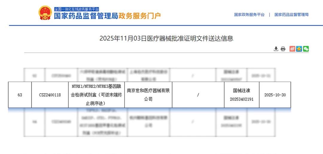 11月5日,南京世和基因自主研发的NTRK1/2/3基因融合检测试剂盒获国家药监局批准上市,用于恩曲替尼胶囊伴随诊断。该试剂盒是国内首个泛实体肿瘤检测试剂盒,对实体肿瘤治疗有重要意义。