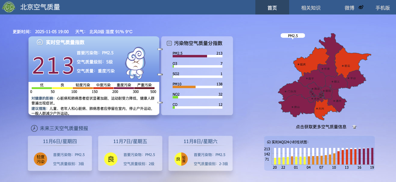 北京市生态环境监测中心数据显示,11月5日19时北京空气质量指数达213,属五级重度污染,首要污染物为PM2.5,凸显空气质量问题的严峻性。